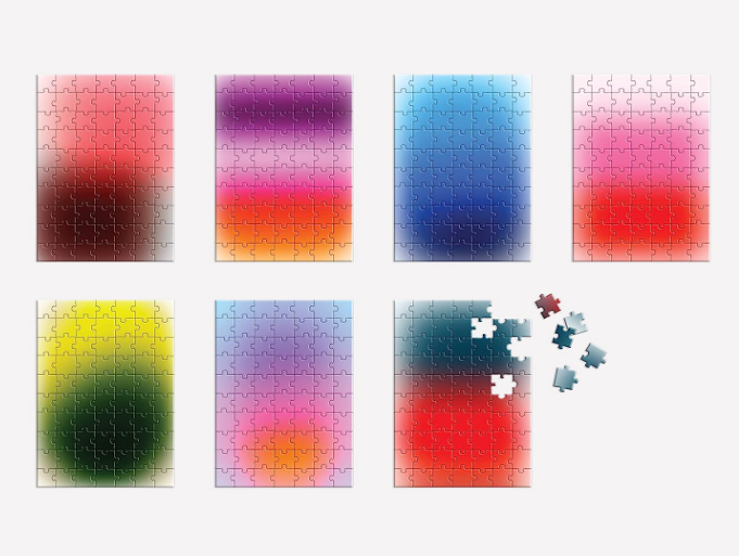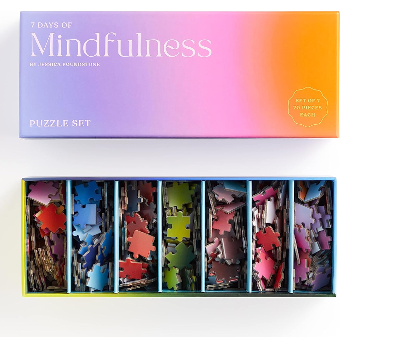 The 7 Days of Minfulness Puzzle Set from Galison includes seven 70-piece mini puzzles, providing a mindful and relaxing activity each day of the week. Each mini puzzle is inspired by color sensation, experiential light, and space art movements, providing a positive and transformational experience.