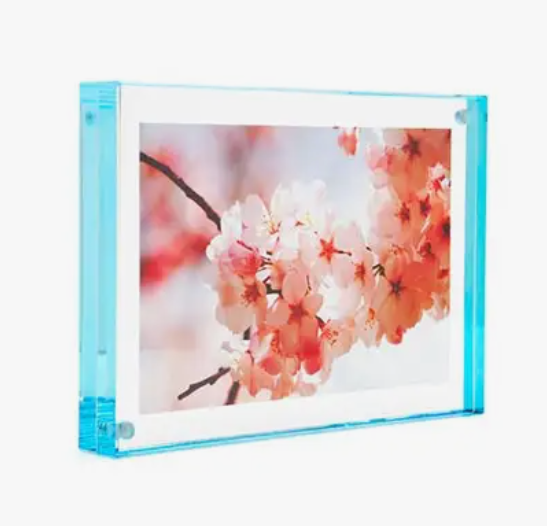 A variation of the original magnet frame ®, the aqua edge magnet frame is made of two thick panels of crystal clear, solid acrylic accented with bright aqua color on the edges. The two panels are held together by tiny magnet points, with the picture easily placed between the two panels and held securely without any hardware. Display 2 photos back to back, horizontally or vertically.