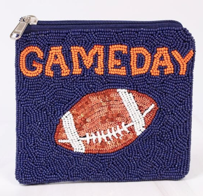 Accessorize your game day outfit with this beautifully beaded pouch! It has a two tone colored design with a sequin football accent on the front. It also has a top zipper closure and a linen feel back. Perfect to throw in your clear bag for an added pop of fun!