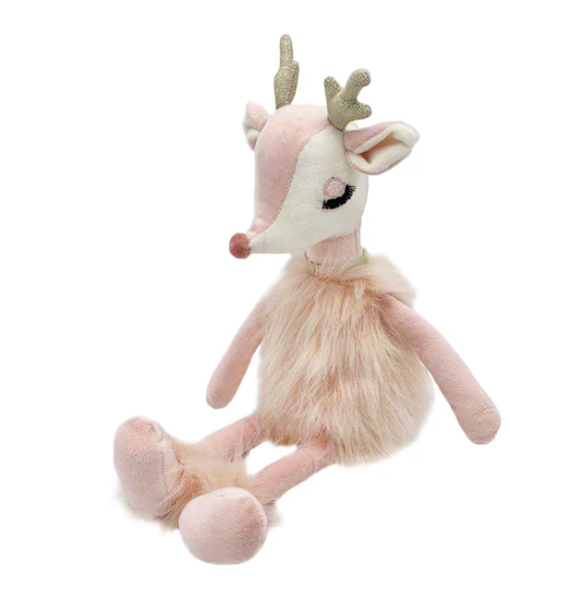 Freija is a fancy reindeer who stands out among her reindeer friends! With a long cotton-candy pink faux fur,dainty pink nose, and fancy gold antlers, she makes an exceptional friend for anyone else who loves a bit of pink and whimsy in a stuffed toy.
