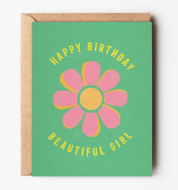 An uplifting and hippie feeling birthday card, featuring a seventies inspired flower graphic.