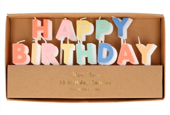 A simple way to turn a cake into a birthday delight is with these mini candles. They spell out the words "Happy Birthday" in a colorful way.
