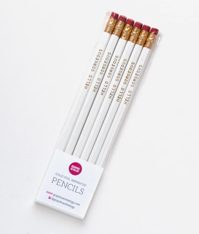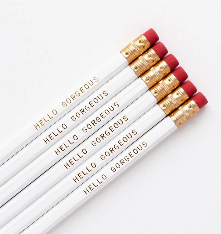 Hello Gorgeous You! Our white and gold foil HELLO GORGEOUS imprinted pencils are No. 2 hexagon pencils with gold ferrules and red erasers and come 6 to a set. Perfect as party favors or stylish desk candy.