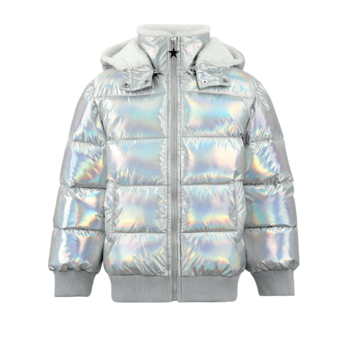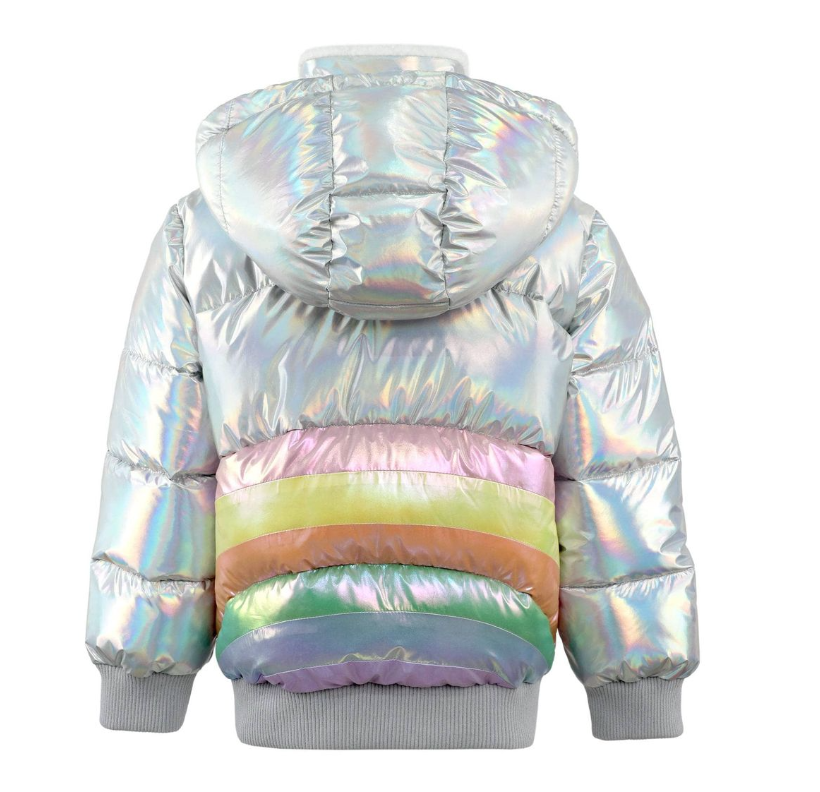- Eye-catching holographic puffer jacket with a stunning rainbow back design for bold, stylish statements.