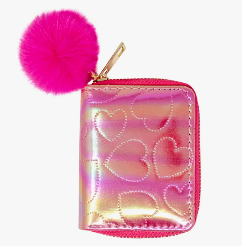This shiny wallet for kids has a dotted heart pattern. These wallets feature a removable pom pom and has multiple slots for cards, bills and change. The zipper enclosure goes all the way around to give easy access. Recommended for ages 3+