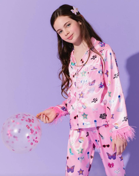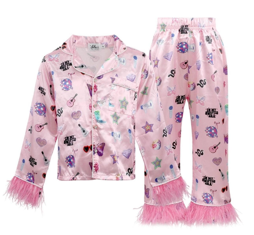 - Glamorous two-piece silky set featuring a vibrant Swiftie-inspired print with stars, hearts, and iconic motifs.
