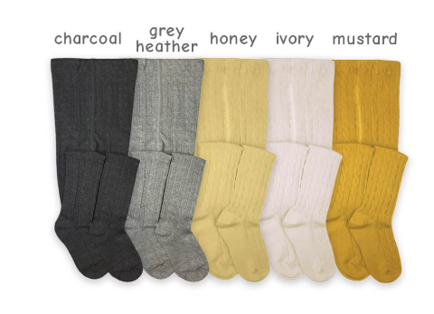 Cable knee high socks that go with everything! Unisex for baby, girls, boys and women! Knit with high quality soft ring spun cotton for added durability. Cotton rich to keep feet and legs super comfortable. Pair with dresses, skirts, rompers, shorts and more!