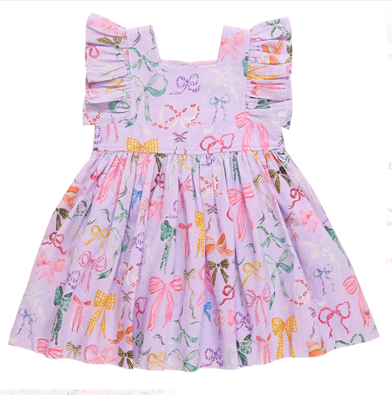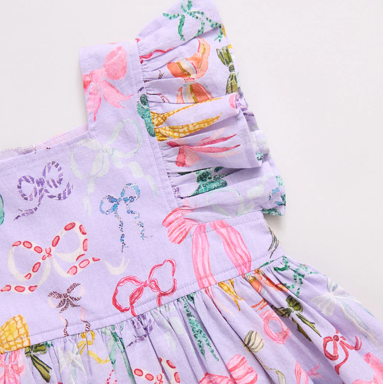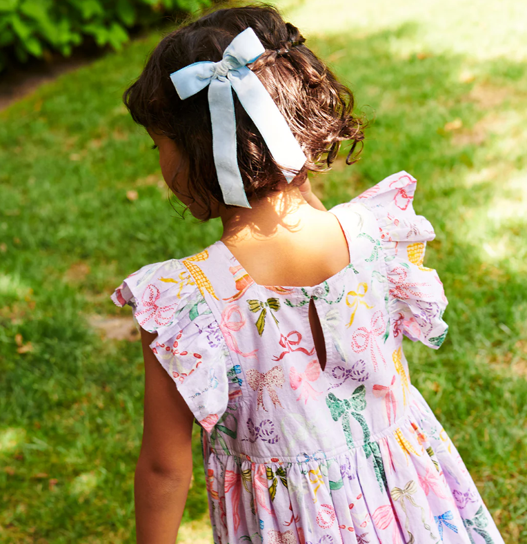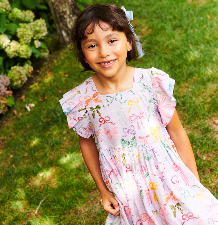 A Bounty Of Bows! A colorful array of ribbons and bows, courtesy of one of our favorite artists Tara Roma Gill, comes to life against a light purple canvas in her lively Lavender Watercolor Bows, shown here on our flock favorite Girls Elsie Dress. Designer details include a square neckline, soft ruffle sleeve and fully gathered skirt. You'll find our signature glitter button closure at the back. Match back to Sister in our Girls Eleven Jumper and Baby Girls Jaipur 2-piece Set.