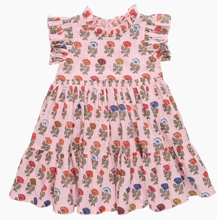 A twirl-ready favorite designed for everyday play and special spring moments alike! This cheerful floral dress features soft ruffles at the sleeves and neckline, a tiered skirt for added movement, and a subtle shimmer woven throughout for just the right touch of sparkle.