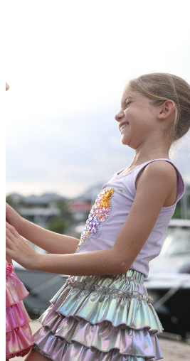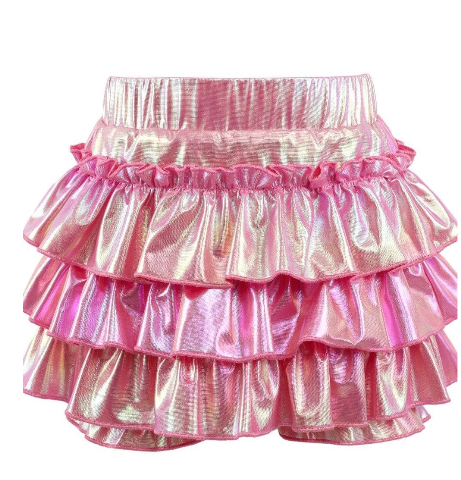 - Make a statement with this skort in silver or pink, featuring layers of iridescent ruffles that catch the light beautifully.
