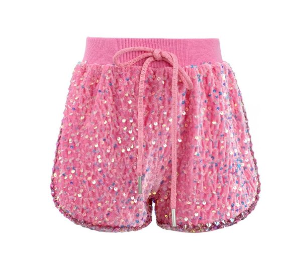 - Sparkling pink shorts covered in dazzling sequins, adding a fun, glamorous touch to any outfit