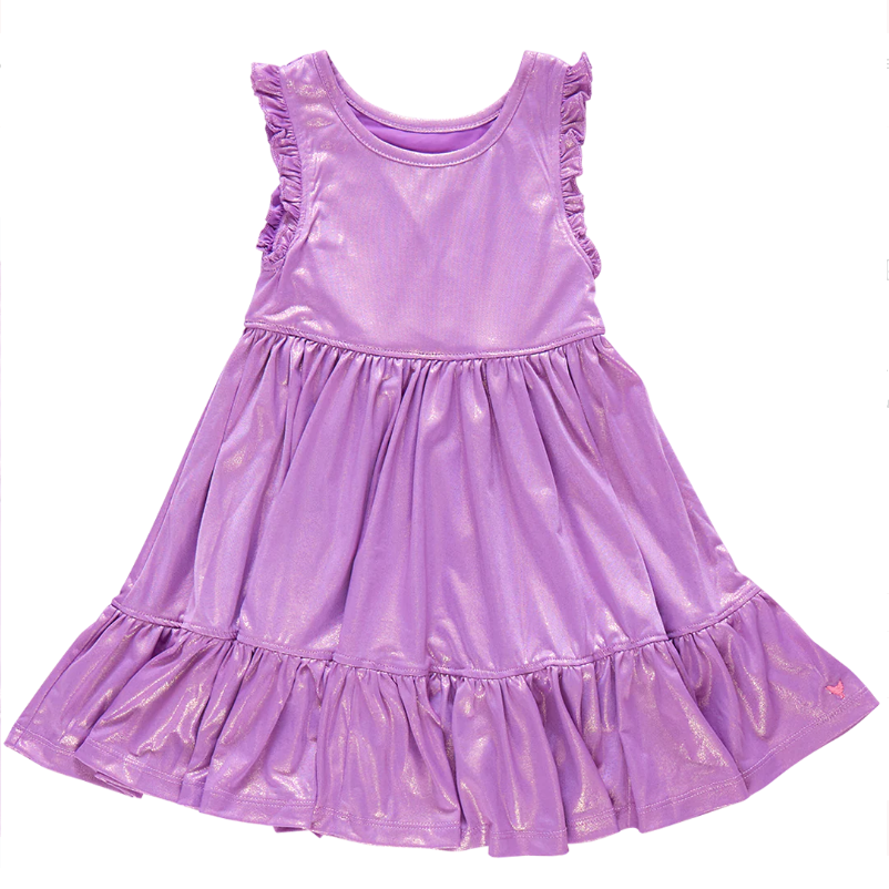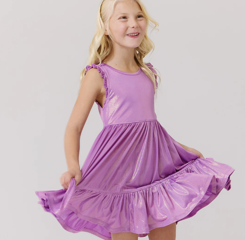 Glam Squad! The spotlight will shine on your little starlet when she takes a turn in our super fun Girls Lamé Kelsey Dress! Fashioned in a shimmery purple lamé, this lively sleeveless piece features a scoop neck, ruffled arm openings and a flowy tiered skirt that will bring joy to your budding performer!