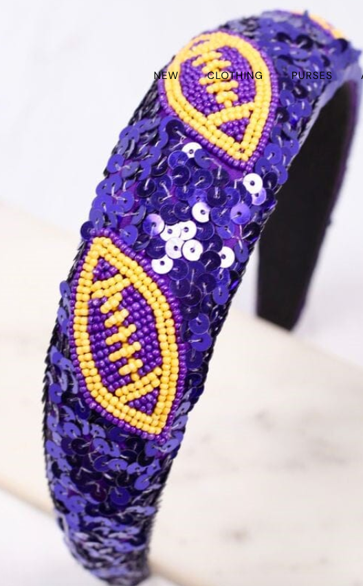 This sequin covered headband has accent beaded footballs in a two tone color design. Pair with your game day outfit to the big game or tailgate for an eye-catching look!