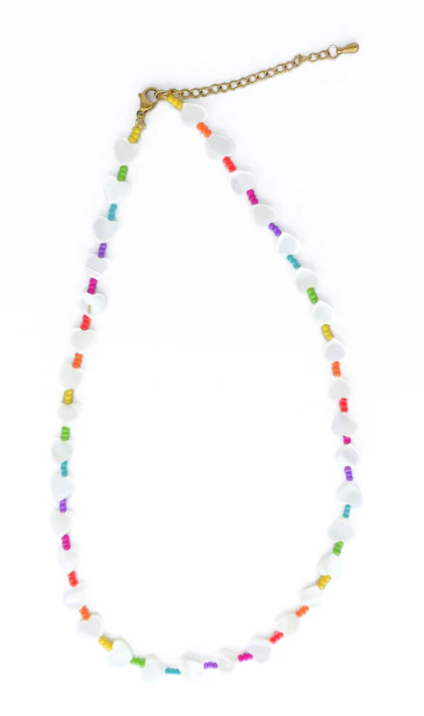 This rainbow heart necklace is so filled with color & love! It is adorned with baby rainbow colored seed beads and white mother of pearl inspired beads.