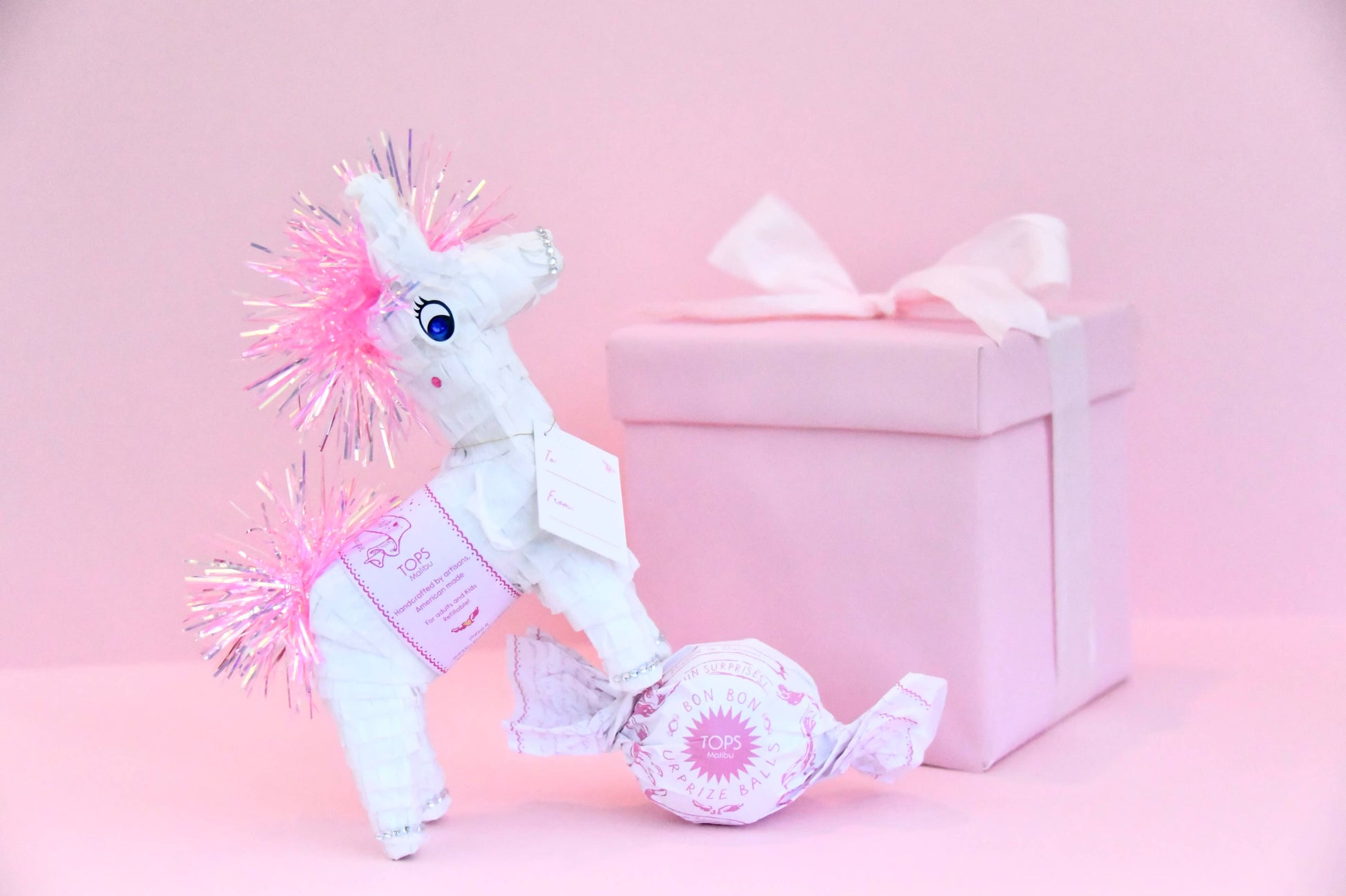 Handcrafted by artisans in the USA, each piñata is filled with fun surprises and adorned with sparkly gems, beads and glitter, making them the perfect celebration tabletop centerpiece or as a party favor for each guest.