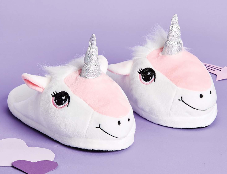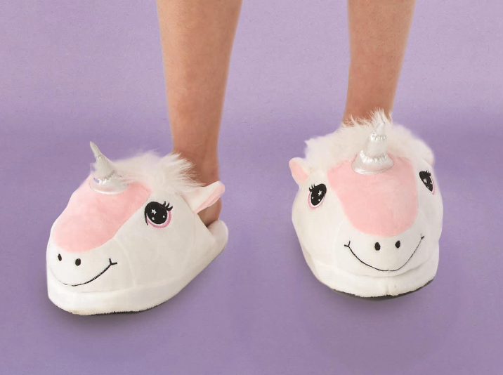 Have a fun pajama party with these Happy Unicorn slippers! Features embroidery, fake unicorn hair and a glittery horn. Easy to slip on and off. Spend your comfy lazy days at home lounging with your unicorn buddies.