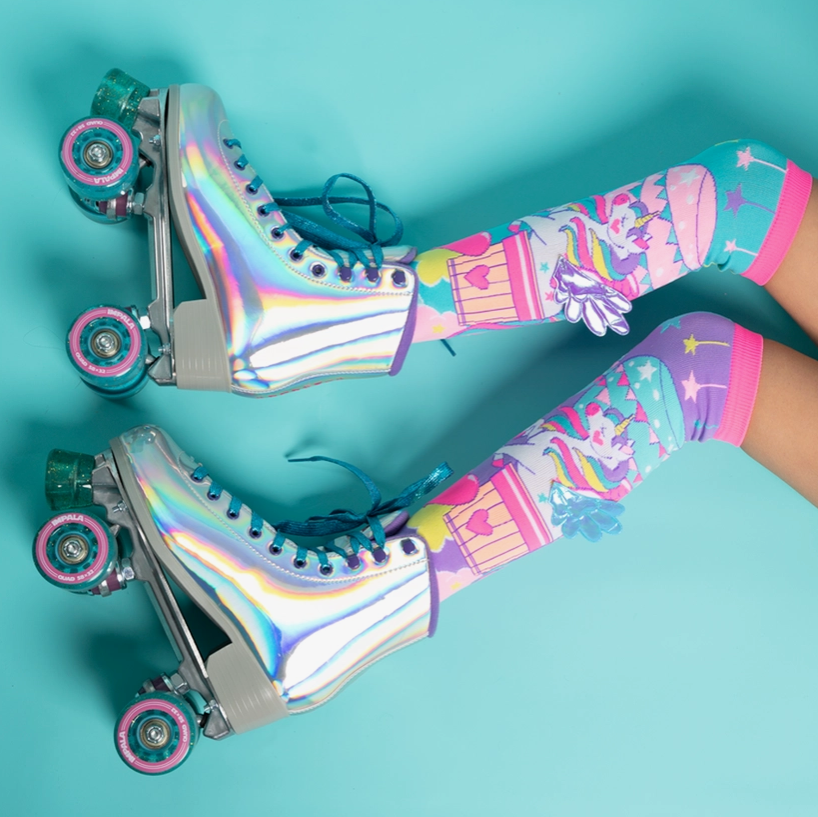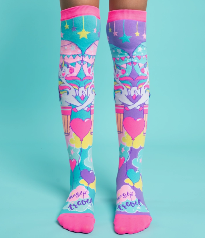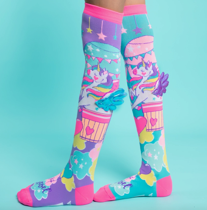 Travel the world and create memories wearing your colourful MADMIA unicorn travel socks with purple and blue wings.