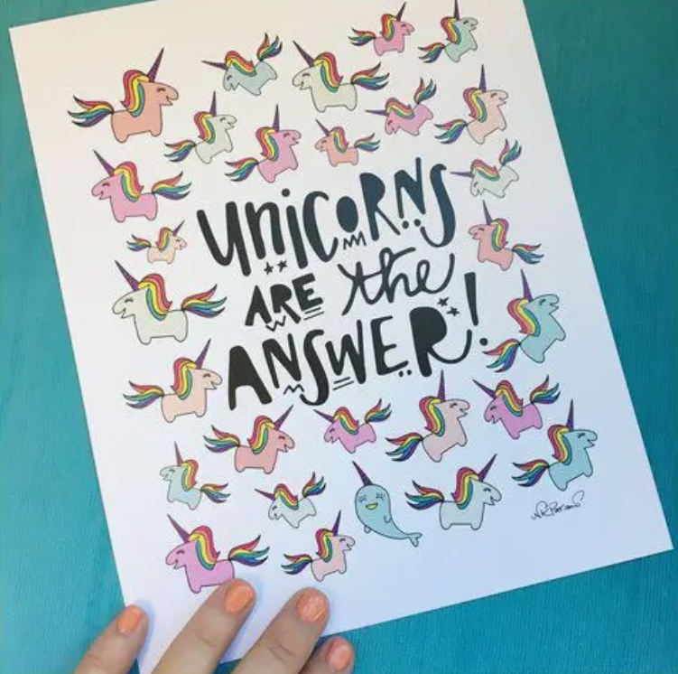 If you need a lot more unicorn in your life, then you've come to the right place. Also, see that sneaky little wannabe down there??? This 8" x 10" art print features my signature hand lettering and original design printed on 85# 100% recycled cardstock.